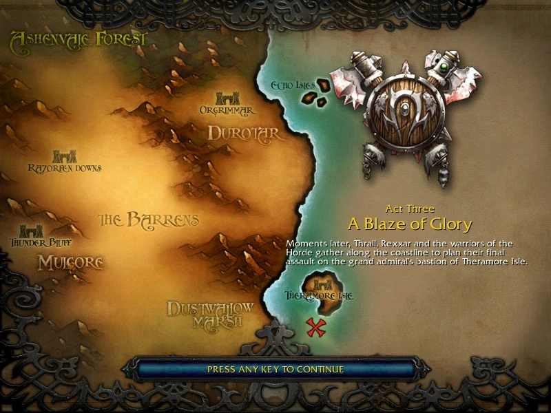 "A Blaze of Glory" is Chapter 3 of "The Founding of Durotar". It was the final confrontation between the Horde, led and championed by Thrall and Rexxar — of the Mok'Nathal — and the Kul Tiras invasion force, led by Admiral Daelin Proudmoore.