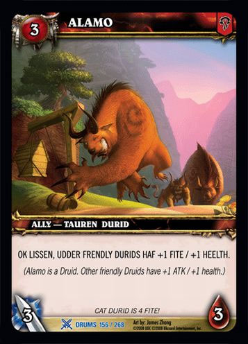 Recently, Blizzard made a tribute to Alamo. On the new TBC Druid spells page, the last three screenshots depict a Tauren male druid in full Dreamwalker, whose name is Alamo. Moreover, Alamo was featured in the World of Warcraft Trading Card Game set Drums of War as a Horde ally. Alamo is also featured in the 2009 April Fools, Introducing the Dance Battle System.