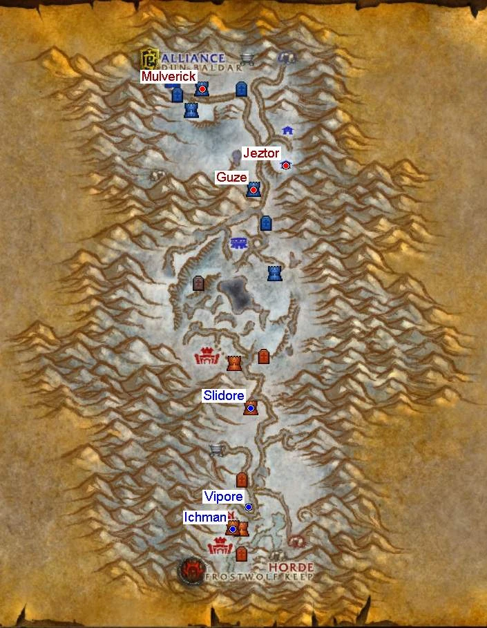 The two generals are raid-level bosses that can be found in their fortresses at the two ends of the map — Vanndar Stormpike ("Vann") for the Alliance north, Drek'Thar ("Drek") for the Horde south. About 15 players need to work together in order to bring one of the generals down. A rather elaborate system of NPCs, fortifications and graveyards fills the map between the generals.