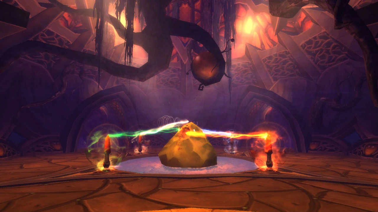 The Amber Womb (also Amber Solar) is a mantid cavern located beneath the southwestern part of the Heart of Fear in the Dread Wastes. The entrance can be accessed via the Venomous Ledge. It appears one of the Klaxxi mantid is being held prisoner inside.
