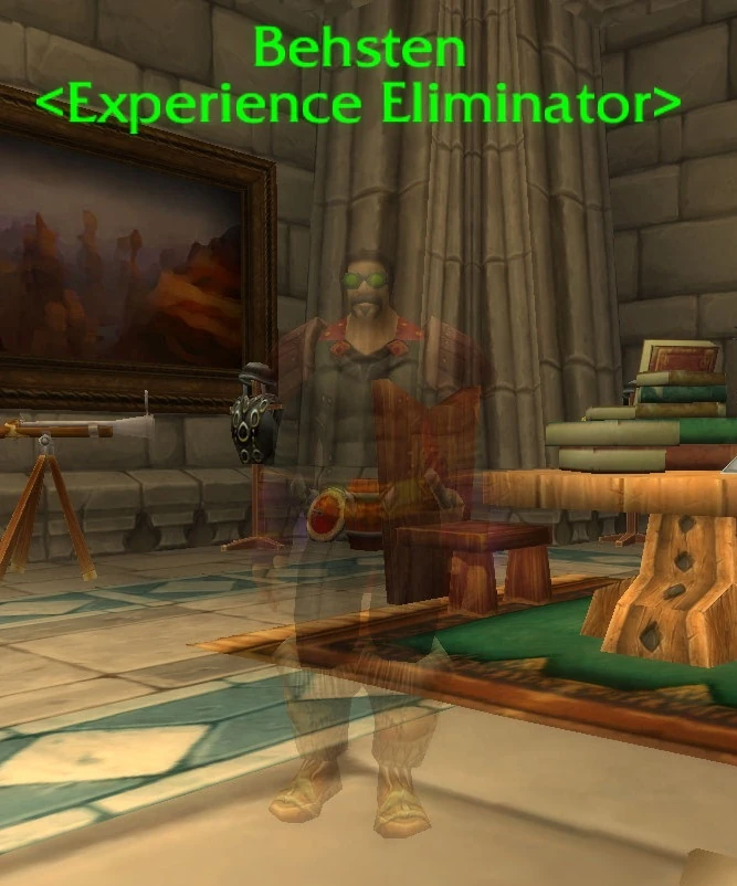 Behsten can be found in the War Room of Stormwind Keep in Stormwind. Behsten gives members of the Alliance access to an option that allows them to turn off experience gain in the game in any form or fashion. The fee is 10