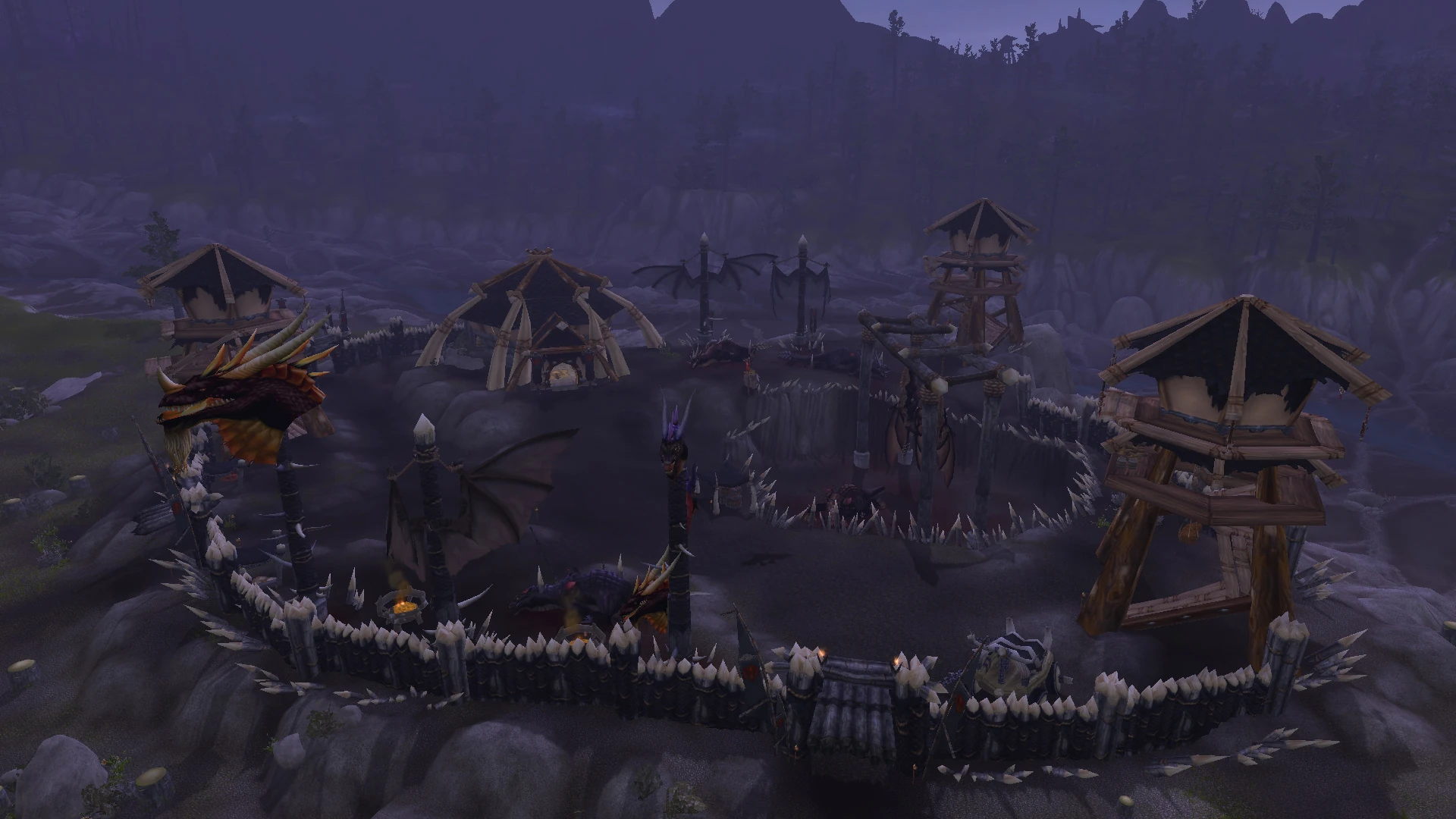 The outpost is dotted with severed and chopped remnants of black drakes, and the orcs here use powerful magic to bind other drakes to their will. They strike out against the Twilight's Hammer clan beyond their walls, discovering Cho'gall's plans run deep in the Highlands. They also take advantage of the weakness of their dwarven neighbors, attempting to rout them from the hills and secure their abandoned supplies.