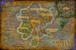 The Broken Isles are a group of islands in the heart of Azeroth. The long-lost Tomb of Sargeras is located on one of these islands. The Broken Shore, located in the southeast, is the starting area for those venturing into the World of Warcraft: Legion expansion. After, however, players are free to pursue the four main zones in whatever order they wish due to scaling - Highmountain, Val'sharah, Azsuna, and Stormheim - culminating at Suramar.[1]