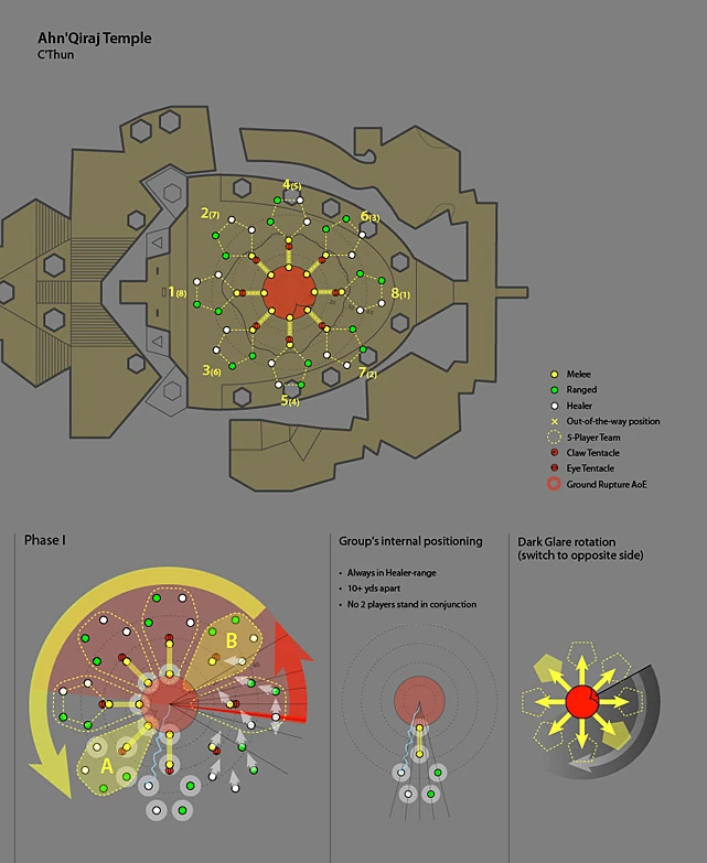 When first entering C'thun's chamber, the best strategy is to shield a player with high nature resist and have him enter the room ahead of the rest of the raid. This will cause the first few eye beams (described below) to hit the player with high nature resist, giving the rest of the raid a chance to get into position. A hunter is the ideal candidate for this, with their +60 Nature Resist from their aura and their ability to feign death and then put on normal gear. If the raid enters the room at the same time it is likely that a large portion will die from a chained eye beam.