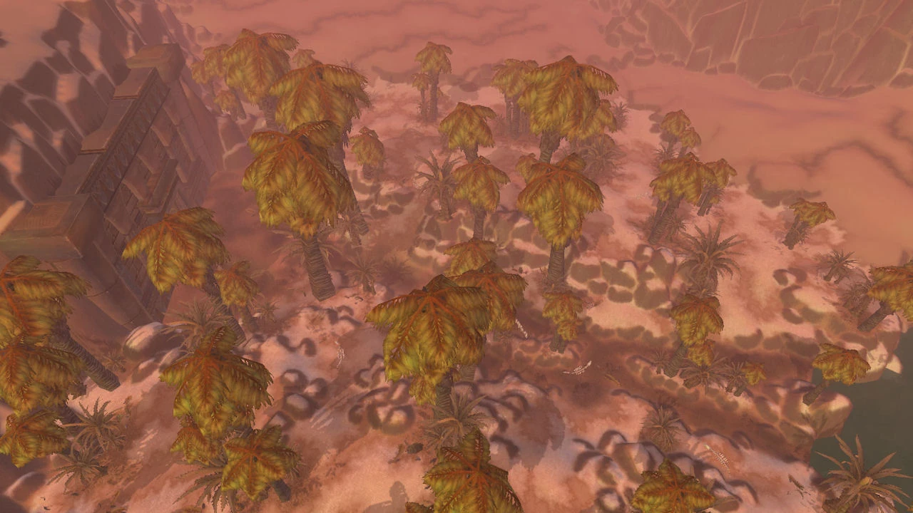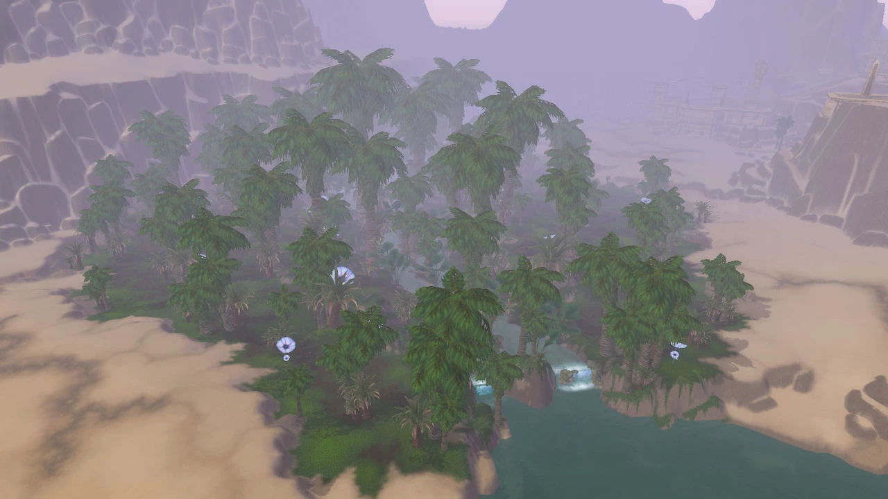 [43.3, 69.3]is located in southern Uldum, east of the Ruins of Ammon, south of the Obelisk of the Sun, and northwest of Neferset City. It is covered by sickly looking palm tress and populated by hostile animal life. The Desert Fox, the elusive prey of Commander Schnottz, can be found sprinting from place to place.