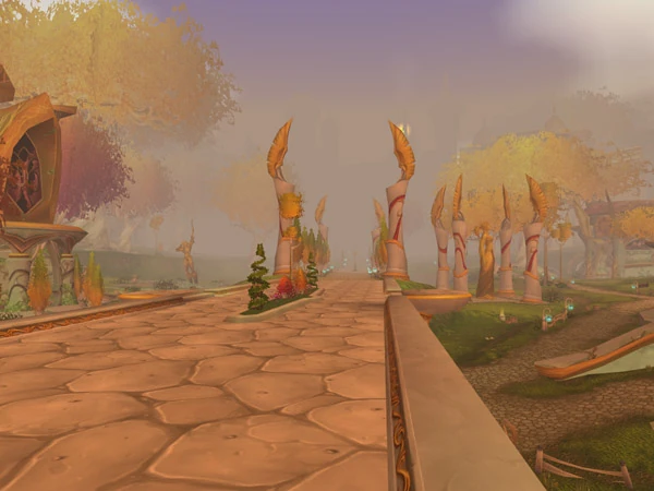 Dawning Lane is the guarded pathway that cuts diagonally through the Ruins of Silvermoon. It runs from the northwest of the ruins to Falconwing Square. The Lane is made up of a raised, tree-lined walkway and two bridges. A Slain Outrunner lies just past the entrance in the northwest.