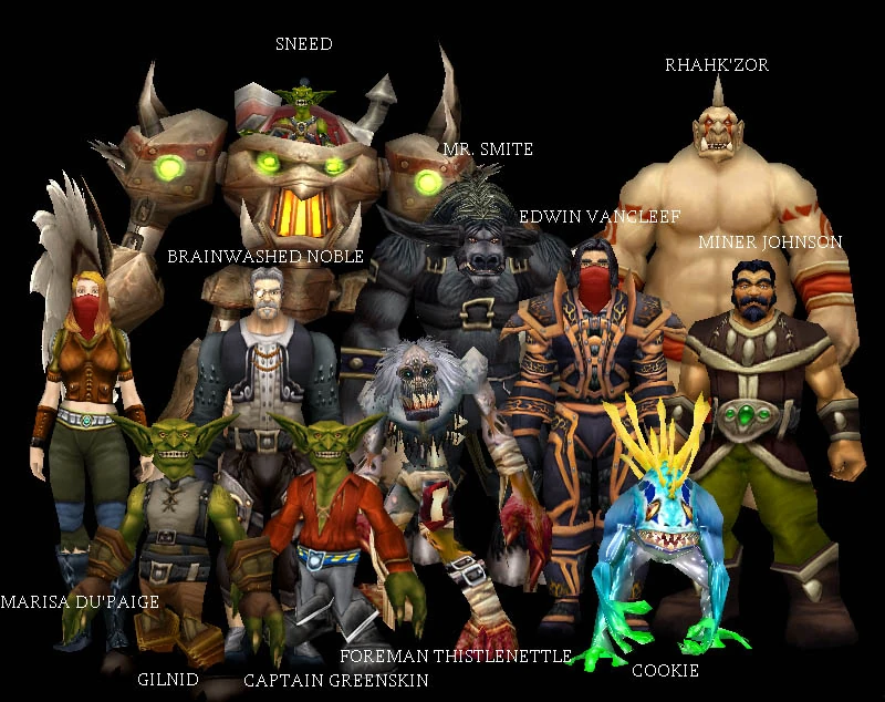 The Deadmines are home to the notorious Defias Brotherhood, and several of its more important members are stationed here. Lua error in package.lua at line 80: module 'Module:Factiongfx/faction_tip_link.json' not found. Sneed and Lua error in package.lua at line 80: module 'Module:Factiongfx/faction_tip_link.json' not found. Sneed's Shredder operate the mast room, Lua error in package.lua at line 80: module 'Module:Factiongfx/faction_tip_link.json' not found. Gilnid the smelter presides over the goblin foundry, and Lua error in package.lua at line 80: module 'Module:Factiongfx/faction_tip_link.json' not found. Mr. Smite the first mate guards the ship. Lua error in package.lua at line 80: module 'Module:Factiongfx/faction_tip_link.json' not found. Captain Greenskin patrols the ship itself, where Lua error in package.lua at line 80: module 'Module:Factiongfx/faction_tip_link.json' not found. Edwin VanCleef himself rules from the ship's cabin.