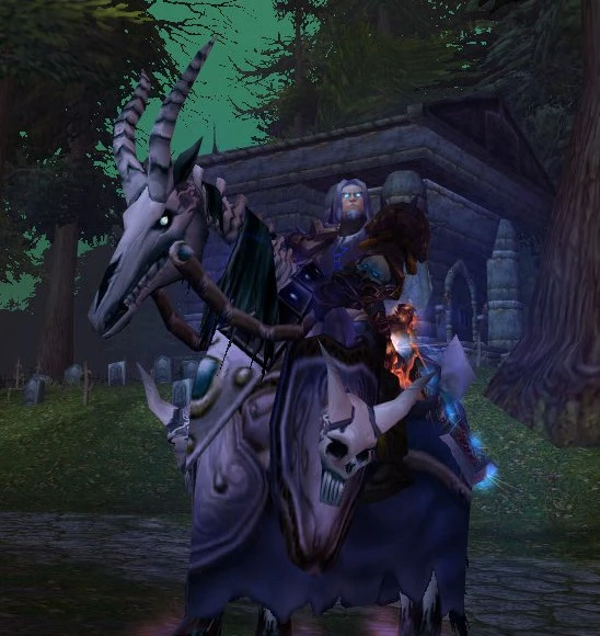 Deathcharger's Reins summon Baron Rivendare's steed, Rivendare's Deathcharger, a mount that adds 100% to movement speed. Prior to Patch 3.0.2 it was extremely rare, even more so than the epic two-handed sword [Runeblade of Baron Rivendare]. Deathcharger shares the same design as the Forsaken epic racial mount, the skeletal warhorse with a blue color scheme. Its use is not restricted by race or faction.