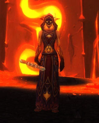 The Devout Harbinger is a night elf officer of Ragnaros and a Druid of the Flame. She can be found within Ragnaros' Reach
