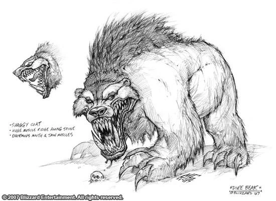 Dire bears are gigantic bears, perhaps 20 feet tall when they rear onto their hind legs. They can grow between 12 feet and 18-20 feet. They can weigh between 6,000-8,000 pounds. They have a rich dark coat of fur in shades between brown and black, and a powerful build. Some have been spotted in Mulgore and Ashenvale. They avoid humans, but show no fear if provoked.