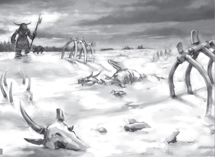Many animals live here, feeding off the dragons’ remains. Birds, bears, spiders, wolves, and bats all tear at the remains or at each other. Wendigo and sasquatch, and worg packs, live here as well. Thanks to the Scourge, undead animals wander here as well, killing and converting the living where they can.[1] (LoM 99)