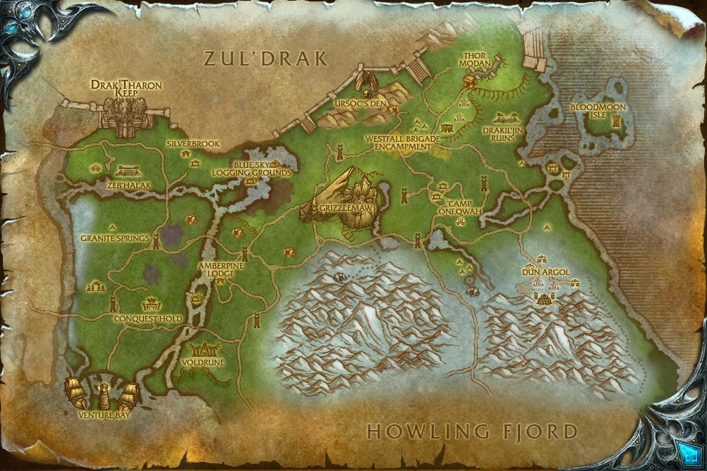 The Scourge controls Drak'Tharon Keep in the Grizzly Hills, just south of Zul'Drak's southwest corner.[3](LoM 176) This ancient stone citadel once belonged to the Drakkari trolls. The Drakkari built Drak'Tharon Keep before the furbolgs built Grizzlemaw. The Frostpaws gathered the tribes together in part to fend off the new Drakkari threat. Both races hated each other; with the new keep the Drakkari were more organized, and the trolls were more unified than the furbolgs, even though the furbolgs had greater numbers. The existence of Grizzlemaw affected the balance, and the furbolgs' victory over the Drakkari in a series of skirmishes may have led to the eventual loss of Drak'Tharon to the Scourge. The Scourge ultimately drove them out and took possession, and now the Scourge has a garrison here holding the mountain passes. It's a well-placed, solidly-built structure, and the small group of undead within can easily hold the keep against forces ten times its size, particularly since they don’t need food or water during a siege.[3](LoM 102, 104) Two thousand Scourge creatures patrol the ruined old keep. They often fight Drakkari and occasionally furbolgs, though they have yet to attack either Gundrak or Grizzlemaw directly.[3](LoM 177) Armed Scourge patrols wander the countryside, scaring anyone they meet. These patrols either attack living people or act menacing to frighten them away.[3](LoM 176)