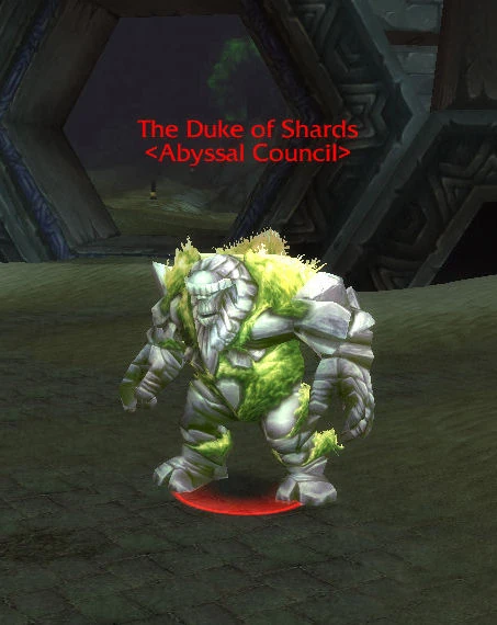 The Duke of Shards <Abyssal Council> is a level 62 elite named mountain giant, and one of the Elemental Nobles of the Abyssal Council. The Cenarion Circle believe that he and and the other three Dukes are the primary force behind the organization of the Twilight's Hammer Cultists in Silithus.
