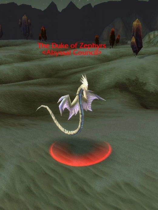 The Duke of Zephyrs <Abyssal Council> is a level 62 elite wind serpent, and one of the Elemental Nobles of the Abyssal Council. The Cenarion Circle believe that he and and the other three Dukes are the primary force behind the organization of the Twilight's Hammer Cultists in Silithus.