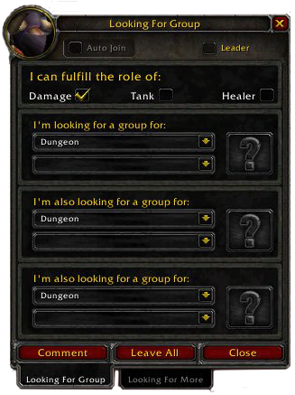 In Patch 3.1.0, after the release of Wrath of the Lich King, the Looking For Group panel was improved to include the role which your currently logged character is able to fulfill (tank, damage, or healer), specify leadership, and identifying groups or individuals via the Looking for More pane.