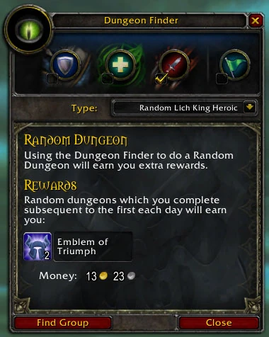 The first screen players see shows the role selection toggles and the type of dungeon desired. By default, the selection is for a random dungeon. This can be changed via the Type dropdown to such options as Random Lich King Heroic, Random Burning Crusade Dungeon, or Random Classic Dungeon. Running a random dungeon confers additional rewards in the form of emblems and gold.