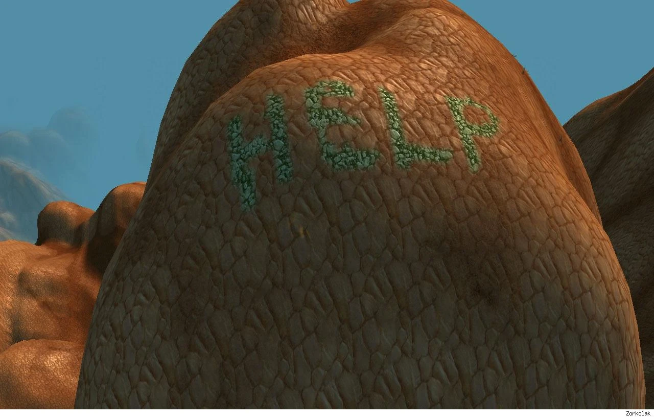Northeast of Thunder Bluff, on top of a mountain is a line of text that reads "HELP" backwards.