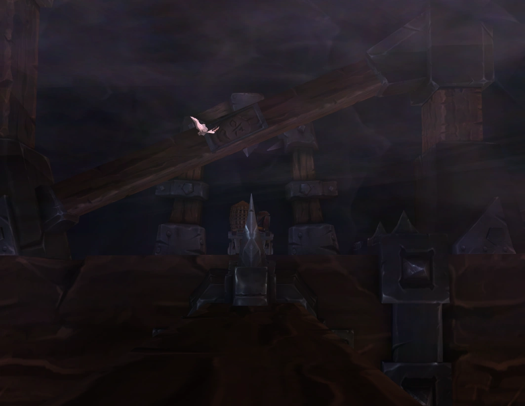 In the Warlords of Draenor Dungeon Grimrail Depot , there is an invisible wall on the rafters which can be jumped over to cross onto a lower beam. At the end of this beam there is a cart stuck in the wall with a cage, a wizard's hat, and an open trunk. There is also a white owl flying