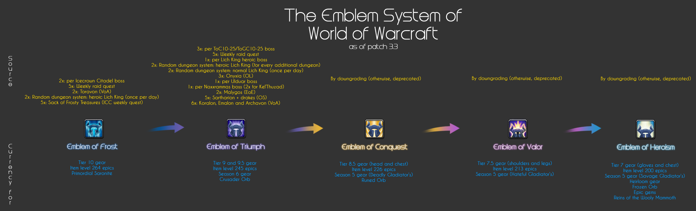 Emblem of Frost was a currency which was introduced with patch 3.3.0. It was used to purchase ilvl 251 and 264 items. Emblems of Frost were converted into Justice Points with patch 4.0.1 at a rate of 11.58 points per emblem.[1]