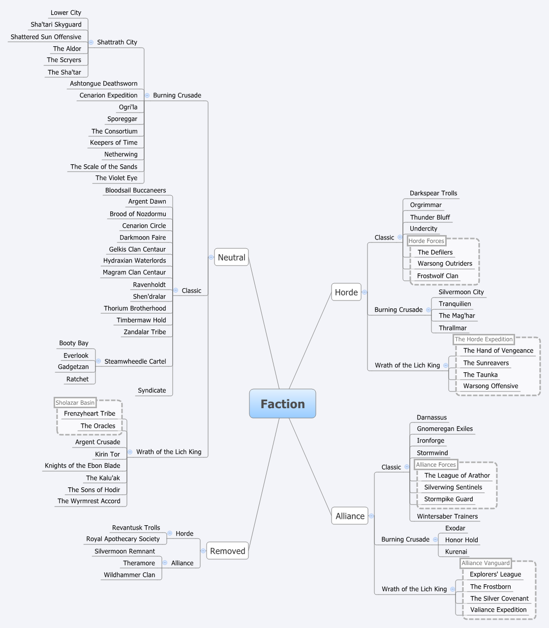 A faction is a group of allies, either racial or ideological. Most in-game factions are described in Warcraft lore, but some were specifically introduced in World of Warcraft. The concept of a faction exists primarily in World of Warcraft. The use of factions in other Warcraft games is more for general grouping purposes and not quantitatively tracked like World of Warcraft.