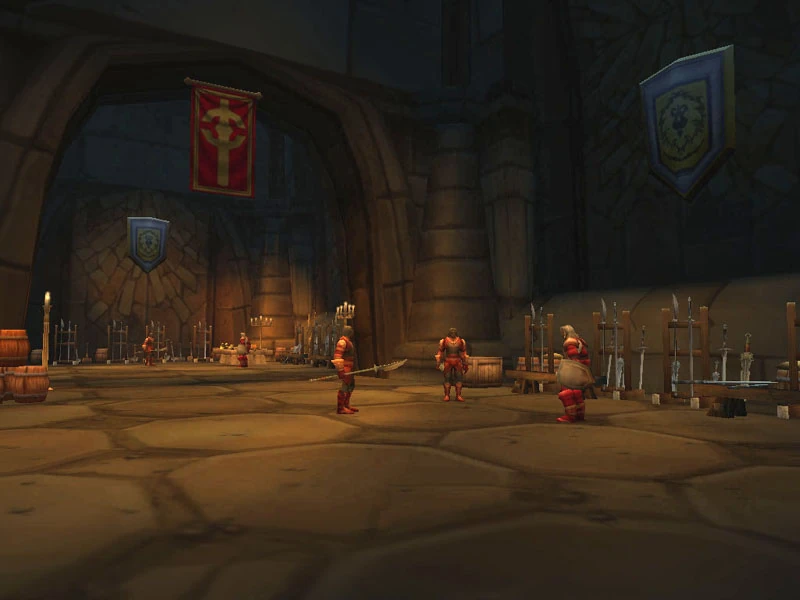 The Footman's Armory is the second area of the Scarlet Monastery's armory wing. It lies beyond the Training Grounds, and is full of members of the Scarlet Crusade. Numerous weapon racks and armor crates line the halls, and a staircase at the end leads on into the Crusader's Armory.