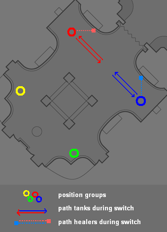 - Doing this with 2 healers would require 1 to (aoe) heal BLUE and yellow/green (depending on corner) and the other healer to heal RED and green/yellow.