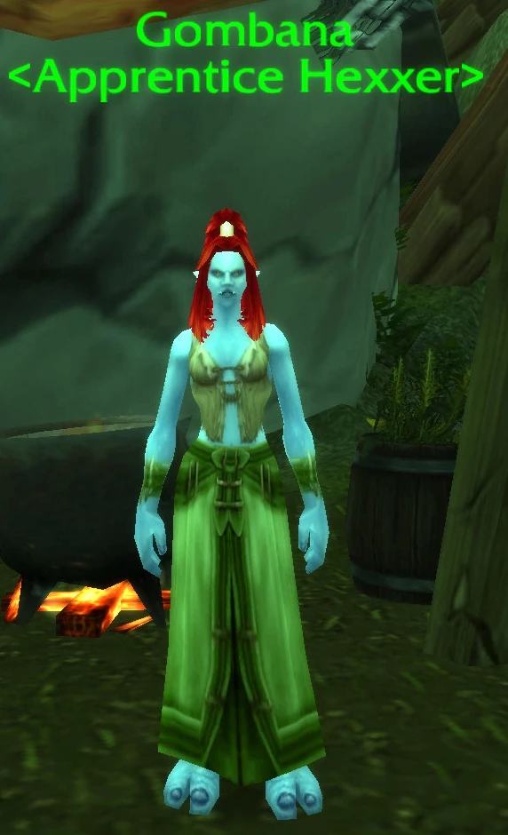 Gombana is an apprentice witch doctor, or hexxer, located at Stonemaul Hold in Feralas. She is studying under Witch Doctor Uzer'i, who also happens to be her father, though she continually refers to him as her master.