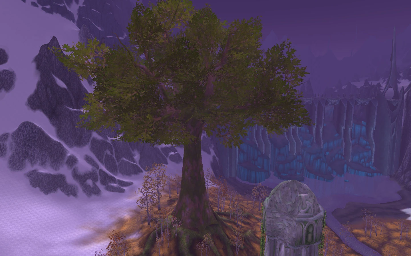 [13, 34]on the continent of Northrend. The only non-crystal in the entire forest, this enormous tree stands near its western edge. Few trees are even close to this one's size — its trunk is easily as thick around as a castle and its canopy rises several hundred feet above the ground. Its roots must be equally deep to pass below the crystals into soil, unless the crystals themselves provide nourishment.