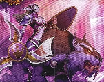 Night elf women are trained in stealth and combat. Many fight to protect their homes, their lands and their people. At the forefront of this army ride the huntresses. This elite cadre calls upon the moon goddess Elune for strength. Huntresses ride their fearsome nightsaber panthers into battle and wield moon glaives with deadly accuracy. In times of peace the huntresses protect night elf lands from trespassers. In times of war, however, they extend their activities to anyone foolish enough to attack their people or their allies. These women are tall and lean, lithe like the cats they ride and so dusk-skinned their purple flesh blends into their panthers' fur, making them seem almost single beasts intent upon slaughter. They wear light armor designed for mobility as much as strength, and each wields a moon glaive that flashes in the night. The huntress is a warrior, first and foremost. She takes the fight to her foes, charging close to the enemy before flinging her moon glaive. The panther's speed and agility allow her to attack quickly, and she often dispatches her first foe with a single toss, spreading terror and panic among those nearby.[2]