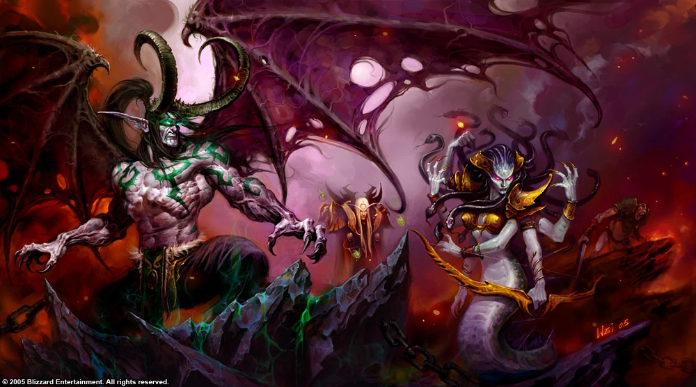 - Illidan's Naga - Calling in some old Highborne debts from ten millennia earlier, Illidan raised the naga from their undersea lairs in order to aid him in obtaining the Eye of Sargeras, as well as preventing Maiev from following him. Under the direction of Lady Vashj - The naga followed Illidan into Outland where they were instrumental in both obtaining the aid of the blood elves and laying siege to Magtheridon's fortress. They now control the watery areas of Outland, including much of Zangarmarsh.