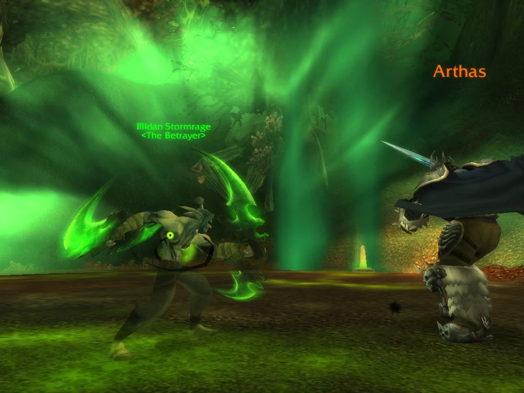 But Illidan was not finished yet. Meeting Arthas at the glacier's base, the two warriors engaged in single combat. After a few minutes of exchanging blows, however, Arthas overcame Illidan's defenses and cut him down. Illidan Stormrage was badly wounded, but not killed. After it became clear for Vashj and Kael that they could not destroy the Frozen Throne, they retreated, eventually back to Outland, taking Illidan with them.