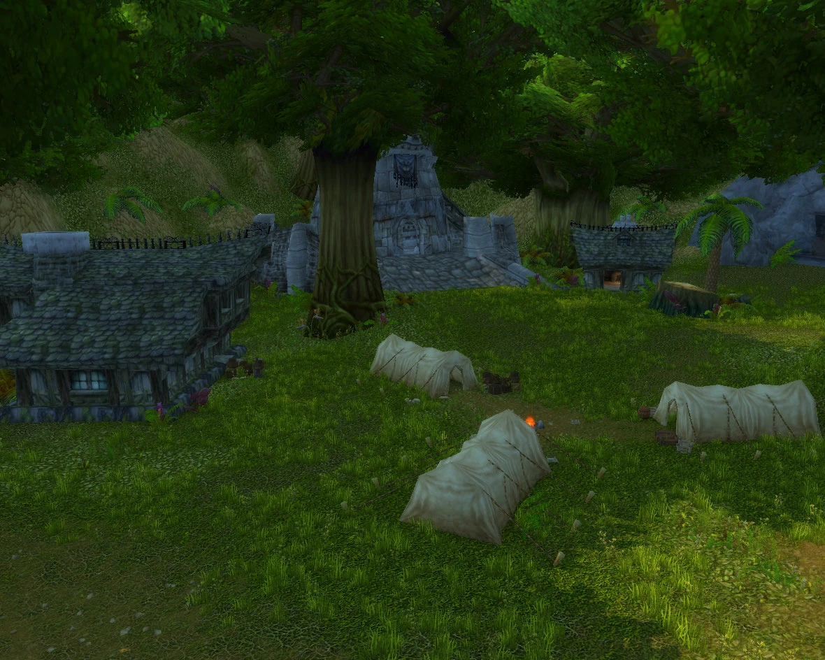 The camp itself consists of multiple buildings, including houses, a lumber mill, stable, and ruined guard tower.