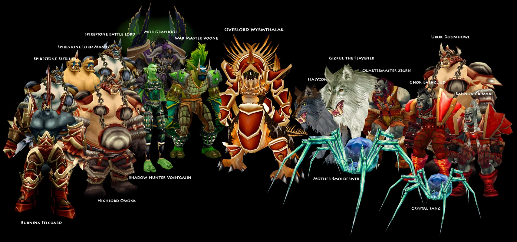 The orcs of the Blackrock Clan dominate most of the ruins of Lower Blackrock Spire, though they are divided up into various legions. These include the Scarshield Legion, the Bloodaxe Legion, and the Firebrand Legion. The elite Blackhand Legion resides in Upper Blackrock Spire. The orcs share the city with a contingent of Spirestone ogres and Smolderthorn trolls, who are also members of Rend's Dark Horde. The ruins are also home to a host of Spire Spiders who have infested a ruined corner of the city.