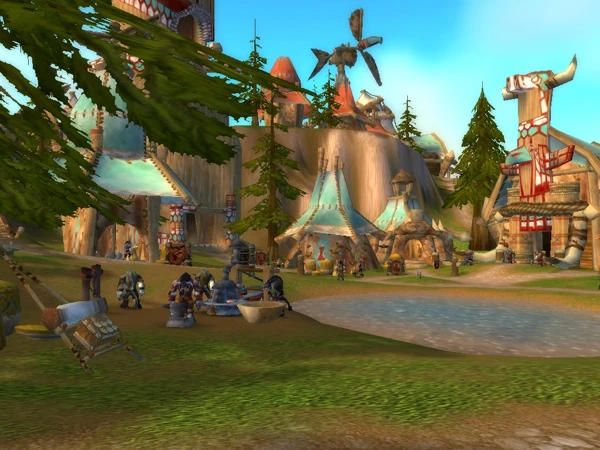 The Lower Rise is Thunder Bluff's main hub of trade, and also contains some professional trainers, as well as several points of interest, such as the inn, the bank, the auction house, and a mailbox. It connects to the middle rise and high rise through the wind rider roost and paths along the edges of the mesa, and to Hunter Rise and Spirit Rise by separate rope bridges. A pair of hydraulic lifts enable the tauren to access the plains of Mulgore below.