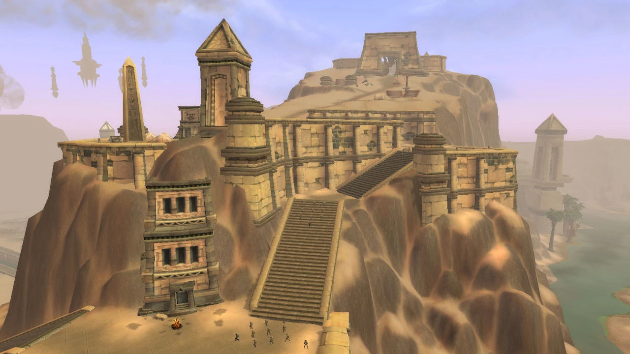 [37.4, 14.2]is located in the northwestern region of Uldum, north of Orsis and the Obelisk of the Moon, and just west of Pilgrim's Precipice. Here men loyal to Commander Schnottz are looting the ancient site. A winding, sandy trail leads from the desert floor, through the Ascent, and up to the Ruins of Khintaset at the top of the mountain.
