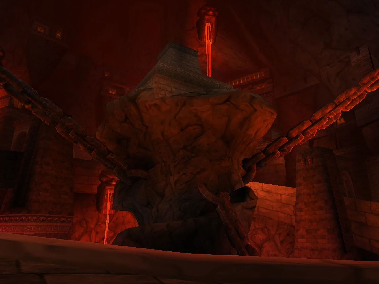 The connection preceding the fortress of Blackrock Spire is a fine construction indeed. This massive stone bridge crosses the gorge of fire created by Ragnaros. If you do not wish to dangle your life high above a pool of lava, you may walk down stairs carved into the rock to an obsidian platform that runs all the way around the inside of the gorge, allowing for travel to another staircase on the other side. You will pass several massive statues of dwarves along the way, anchoring adamantine chains that suspend a great wedge of earth over the lava flow.[1] (LoC 43)