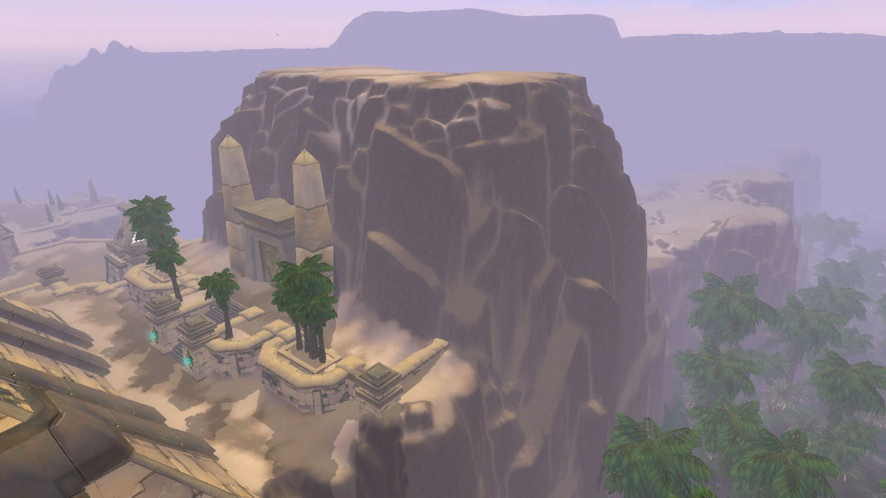 [54.4, 75.4]is a large, flat-topped mountain that overlooks Neferset City from the north in Uldum. There are few Neferset forces defending it, and Salhet thinks it might be a valuable strategic point that will aid the Ramkahen in their invasion of the city. It is lightly guarded, and players escort a small band of fighters to take the peak.