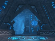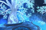 Originally the exclusive domain of Malygos, the Aspect of the blue dragonflight, the Nexus has expanded considerably as other blue dragons choose to live near their leader and partake of his wisdom. The Nexus is an extensive series of caves and tunnels that riddles Coldarra. Every space has been carved and smoothed so that it seems more like a castle buried in ice than a natural formation. The walls are ice and crystal, and cast rainbows of light from small glowing gems set in strategic locations; most flat surfaces are carved to show dragons in various activities. The floors are solid stone, polished glass-smooth and mirror-bright. No stairs exist — in many places an archway opens onto a vast open chamber and the dragons simply fly across to another portal placed somewhere on the other side. The outermost chambers are dotted with lifelike ice statues — the statues are the remains of uninvited guests, transformed by dragon magic and placed here as a warning. The caves themselves are fascinating, and many have unusual magical properties, some of the rooms may actually change.[2] (LoM 96)