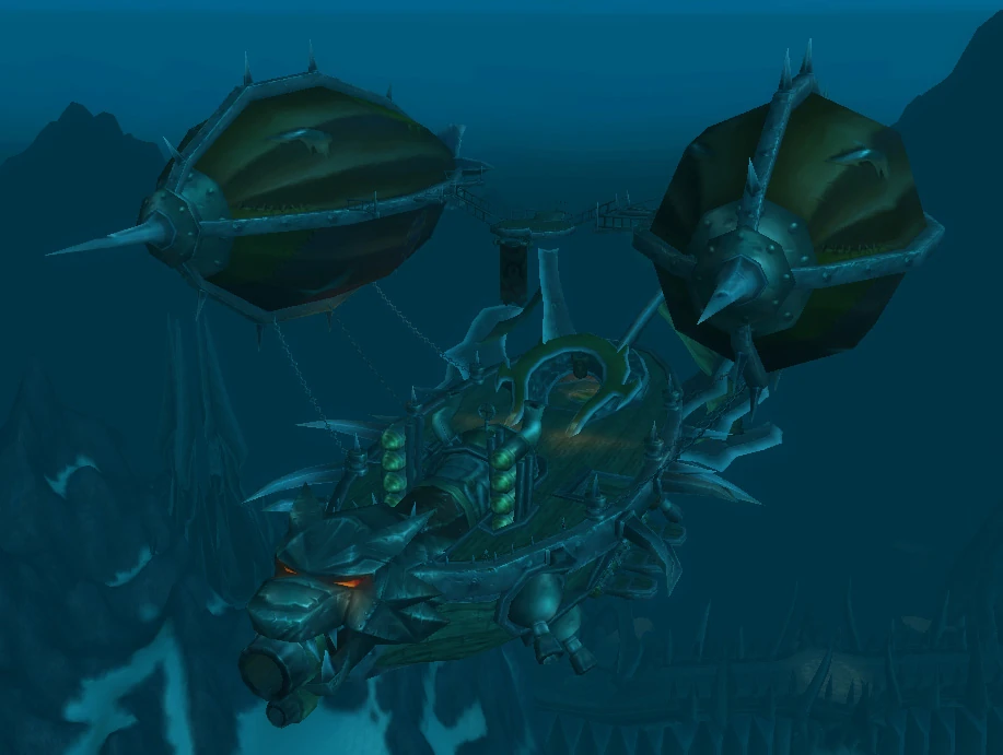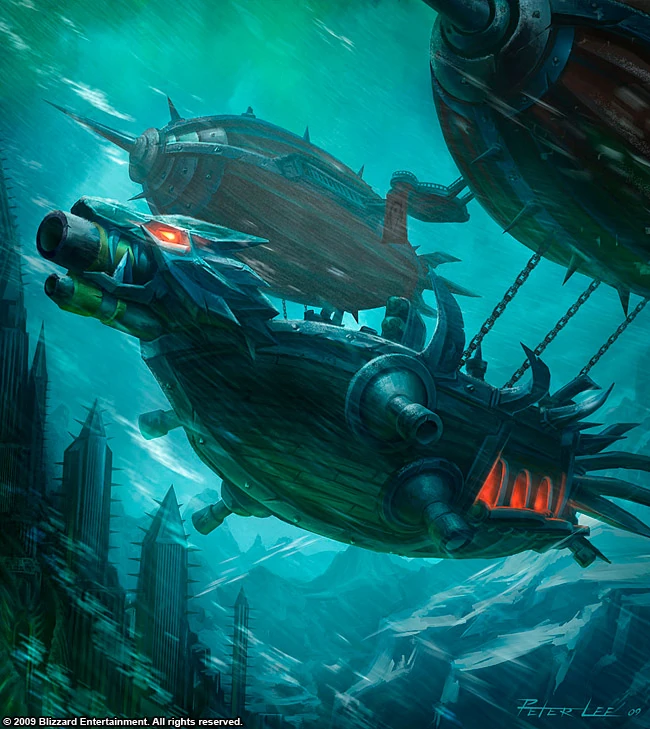 The latest in goblin zeppelin engineering, the ship is held aloft by two large balloons on either side of it. In order for engineers to service both balloons, and to prevent them from drifting apart, a large metal catwalk links the two together. While the balloons would appear rather delicate and vulnerable at first, a closer look reveals that solid steel hides beneath the crude fabric. Unlike most goblin Zeppelins, which are prone to malfunction, this gunship bolsters a better use of Goblin mechanics, keeping it from malfunctioning, such as the normal Zeppelins are prone to do.
