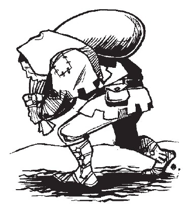 No matter how loudly a knight might boast of his deeds, the truth is that no army could survive, much less win, without peasants. These lowly men, armed with little more than staves and clubs or picks and axes, and often completely unarmored, are the force that allows an army to function. The man standing before you is clearly a peasant, dressed in nothing more than dirty, torn shirt and ragged pants. He wears black boots and his head is bare, though he does have a threadbare cloak to ward off the night chill. He carries a mining pick over one shoulder and a burlap sack over the other. Peasants have no desire to fight, and only attack when forced or when terrified. In battle they forget all discipline and simply charge, waving their picks and shouting incoherently.[1] (APG 186)