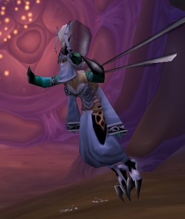 Qiraji battleguards (possibly also known as swarmguards) are flying, feminine qiraji warriors with long scythe-like claws hidden under their sleeves. They are very fast and agile, but also less armored than other types of qiraji. It seems to be that the battleguards must constantly keep their face covered. They are apparently the female counterpart to the qiraji gladiators, but how qiraji actually reproduce is unknown. It is also unknown where their clothing ends and their carapace begins, however, their shoulder guards do detach upon death.