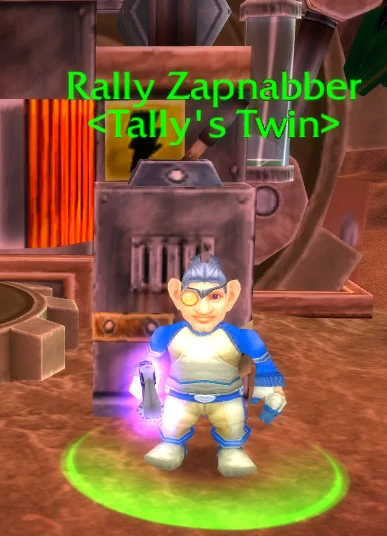 Rally Zapnabber is a gnome at Toshley's Station in Blade's Edge Mountains, who lets Alliance players test out Tally Zapnabber's Zephyrium Capacitorium. He is one of Tally's clones, called "twins", the other being O'Mally Zapnabber in Evergrove.