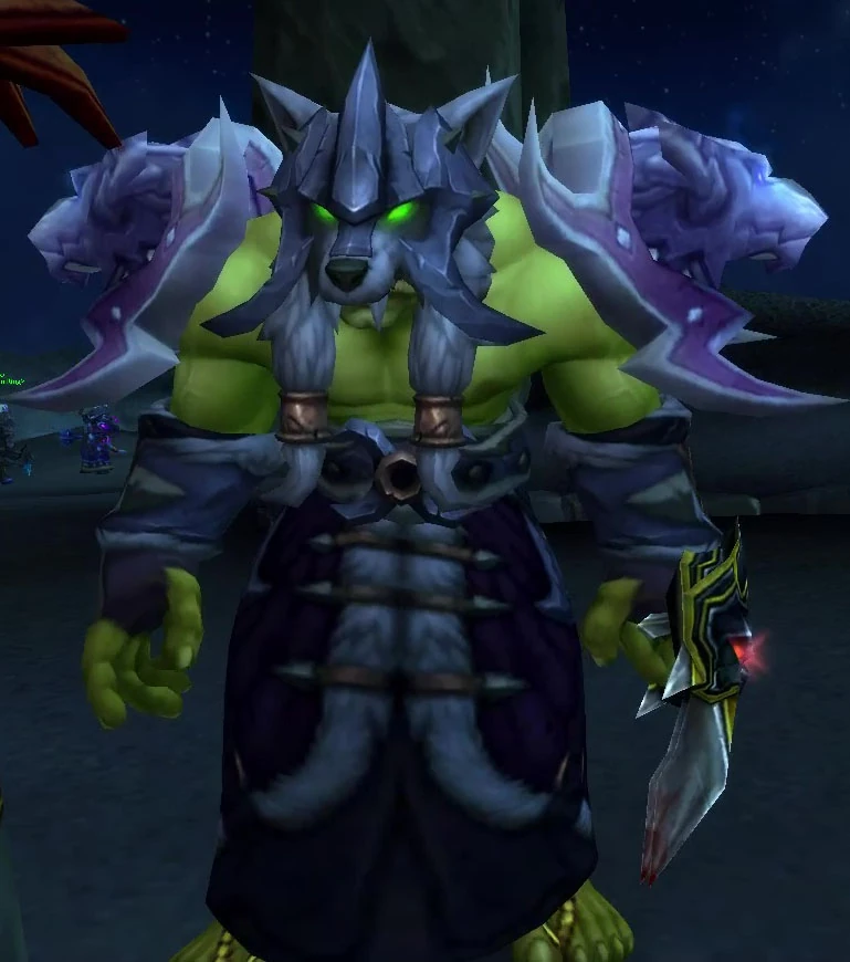 Rehgar appears to be wearing the Epaulets of Ten Storms. He wields a fist weapon, likely a two-bladed version of the orc claws of attack, in his off-hand.