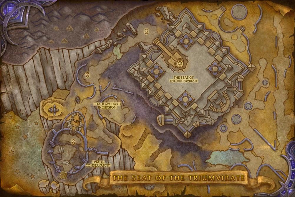 The Seat of the Triumvirate is the ancient eredar capital once ruled by Velen, Archimonde, and Kil'jaeden. Players venture through the ruins in search of a powerful lost relic and help Alleria uncover a dark secret.