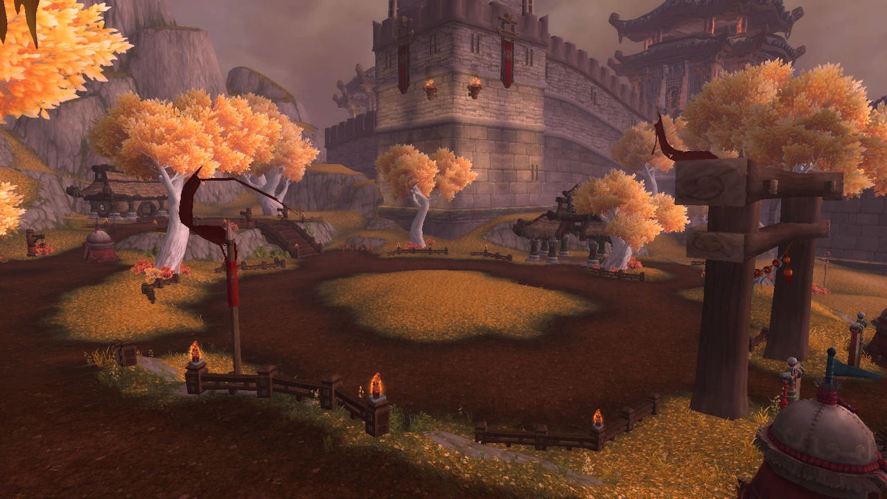 The Setting Sun Garrison is a large pandaren military compound located in the far southwestern corner of the Vale of Eternal Blossoms near the great wall that blocks off the Dread Wastes. It is primarily occupied by the Shado-pan monks, but members of the Golden Lotus can also be found here.
