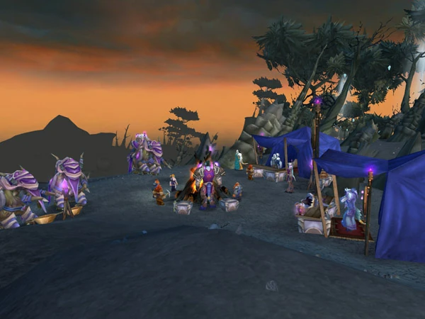 The Sha'tari Base Camp is an encampment defended by Sha'tar vindicators. It is located southwest of Auchindoun in Terokkar Forest's Bone Wastes.
