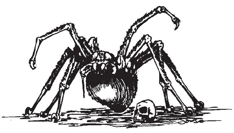 Poisonous and huge, these spiders are found in dwellings long forgotten by time and man. Their bite is venomous, and their many legs make them an agile opponent. Having grown so large from years of hunting increasingly larger prey, they have learned to hide in dark places and attack from the shadows.[2] (W1ManH 38)