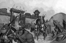This southern town lies just off the swamp's only road. While populated mostly by orc warriors, some orcs do follow their calling as shamans. It is protected by 8-foot walls, and sentries watch every gate. Although there is little traffic through the swamps, the orcs must guard against Alliance attacks. They send caravans to their allies in Stranglethorn Vale to trade for supplies twice a year, though the town does boast several weapon-smiths who create beautiful weapons with the ore they trade for.[1] (LoC 59)