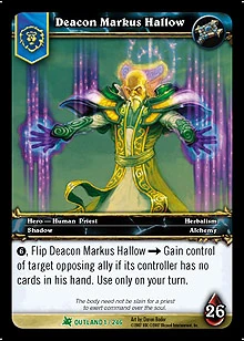 Text (6), Deacon Markus Hallow --> Gain Control of target opposing ally if its controller has no cards in his hand. Use only on your turn.