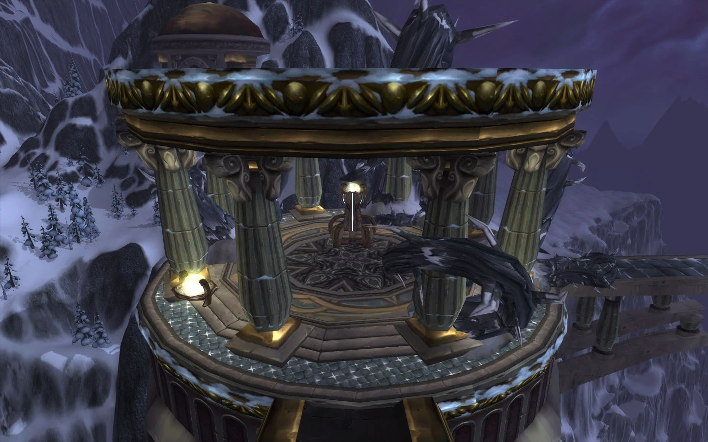 The Temple of Wisdom is one of the many Titan temples of the Storm Peaks, located southwest of Ulduar's Halls of Stone. The columns of the Temple are entwined by strange twisted growths, possibly some kind of plant growth or the dead tentacles of a Forgotten One, as they bear a resemblance to the tendrils of C'Thun.